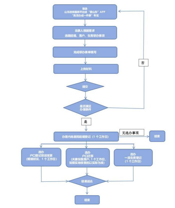 二、提升联办平台服务。线上依托山东省级政务服务平台、“爱山东”政务APP,通过“高效办成一件事”专区提供在线服务。全面落实婚姻登记“全国通办”、网上预约等政策。推行生育登记电子证在线下载打印,不断提升公共服务及时性和便捷度。在现有户口迁移联办事项中,单向增加“夫妻投靠个人申请”模块。线下继续保留咨询服务窗口,为办事群众提供服务指南、业务流程图、材料清单等,协助有需求的群众通过登录网上专区进行业务联办,认真落实首问负责、限时办结等制度,做好系统突发故障应急处置。